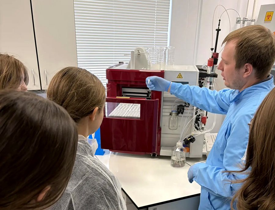 Главный научный сотрудник центра геномных исследований мирового уровня по обеспечению биологической безопасности и технологической независимости от ФБУН ЦНИИ Эпидемиологии Роспотребнадзора, кандидат биологических наук Александр Игоревич Тюменцев провел для школьников экскурсию по экспериментально-биологической лаборатории Института. Гости смогли увидеть современное высокотехнологичное оборудование, предназначенное для выполнения инновационных геномных исследований, узнать о принципах его работы и тематике проводимых исследований.
